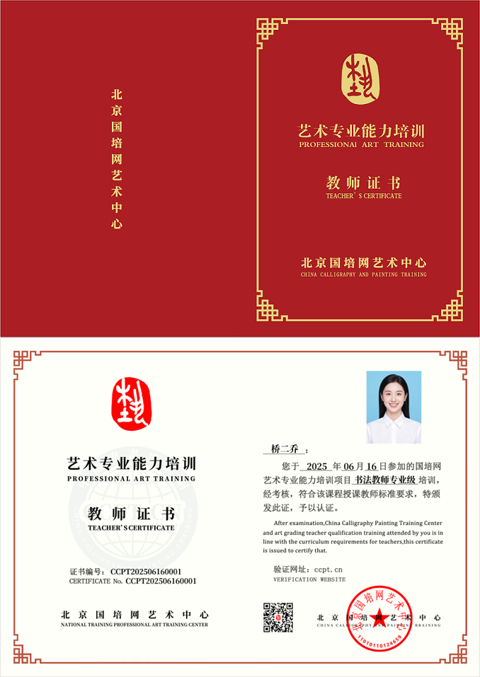 | 证书介绍: 考试合格取得的证书为国培网艺术中心颁发的《书法/美术教师证》,证书编号具有唯一性,可通过第一步:国培网官网:www.ccpt.cn 或百度搜索:“北京国培网艺术中心”进行查询。 |